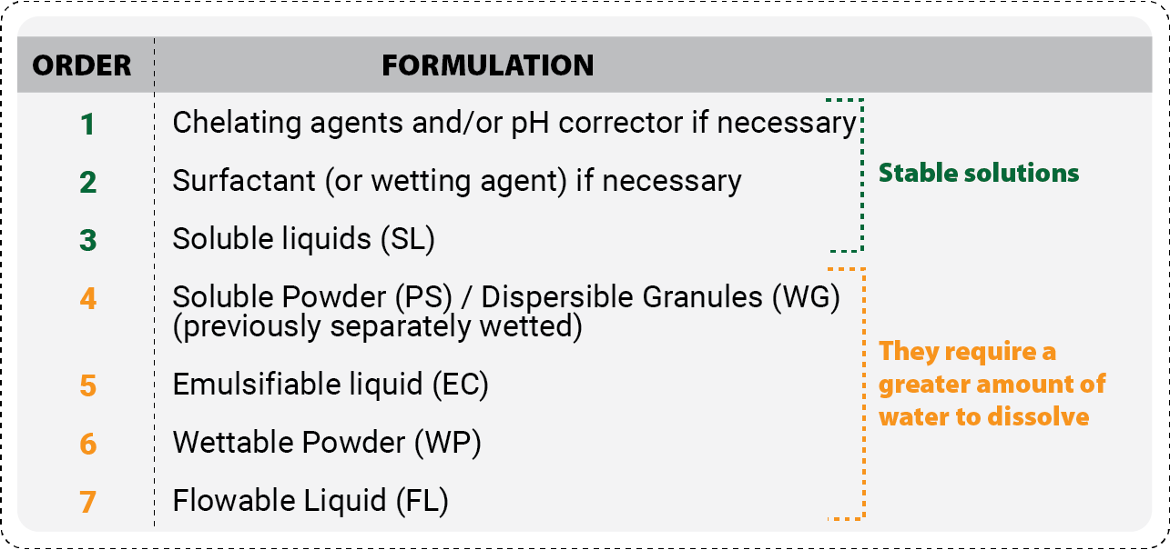The order in which the mixtures are prepared in the tank depends on the formulation and NOT on the type of product (herbicide, fungicide or insecticide). To achieve the effectiveness of the mixture, it is necessary to respect an order that ensures that the soluble matter dissolves first.
