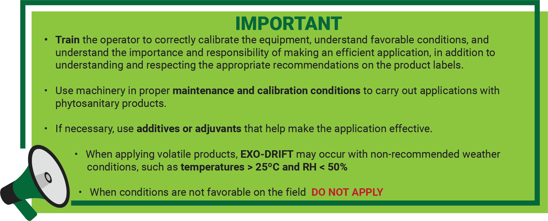 - Small droplets applied with winds >15km/h produce EXO-DRIFT. It can also occur with volatile products with temperatures >25ºC and RH <50%.