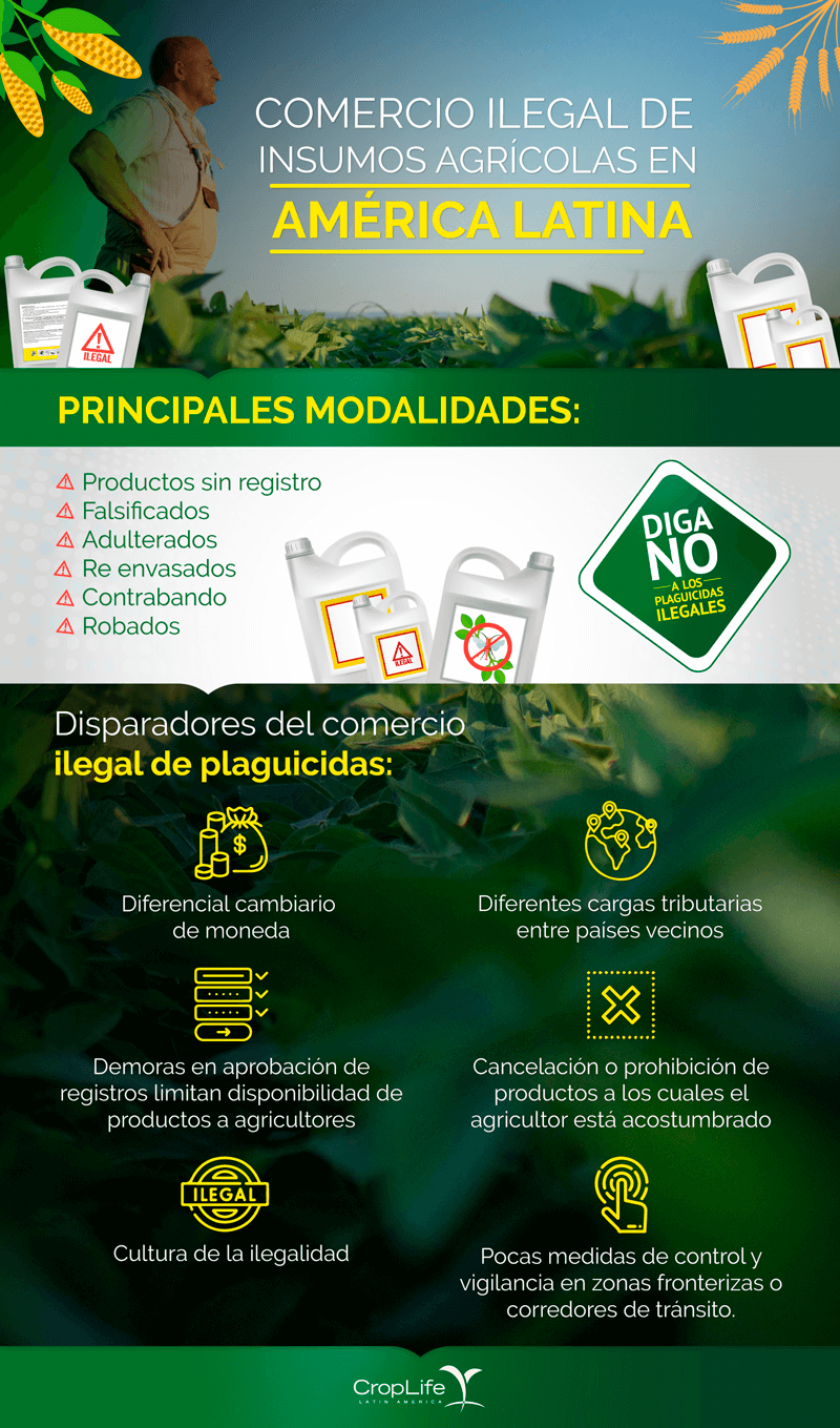 Productos sin registro, falsificados, adulterados, re-envasados, de contrabando o robados son las modalidades de comercio ilegal de agro insumos en América Latina, así lo confirma CropLife Latin America, que lidera una campaña de sensibilización frente a este delito que afecta la salud, el ambiente y la economía.