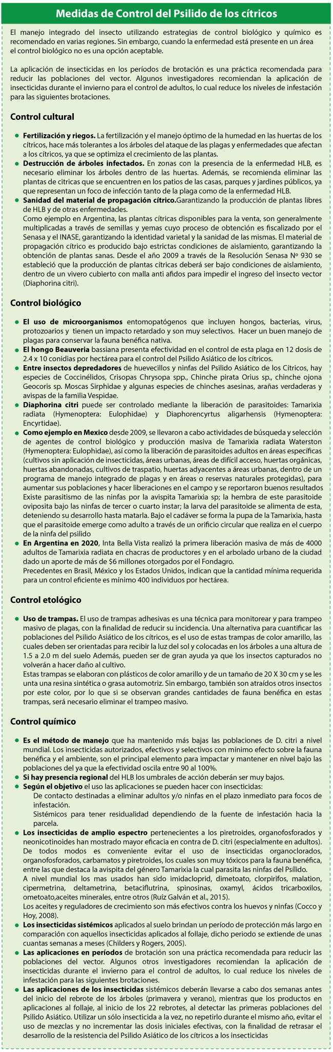 - Establecimiento de un programa de control químico con productos de bajo impacto ambiental y con criterios de rotación para evitar el desarrollo de resistencia en el vector, así como de un programa de control biológico para el manejo del vector mediante la producción y liberación del parasitoide Tamarixia radiata (Waterston) (Hymenoptera: Eulophidae)