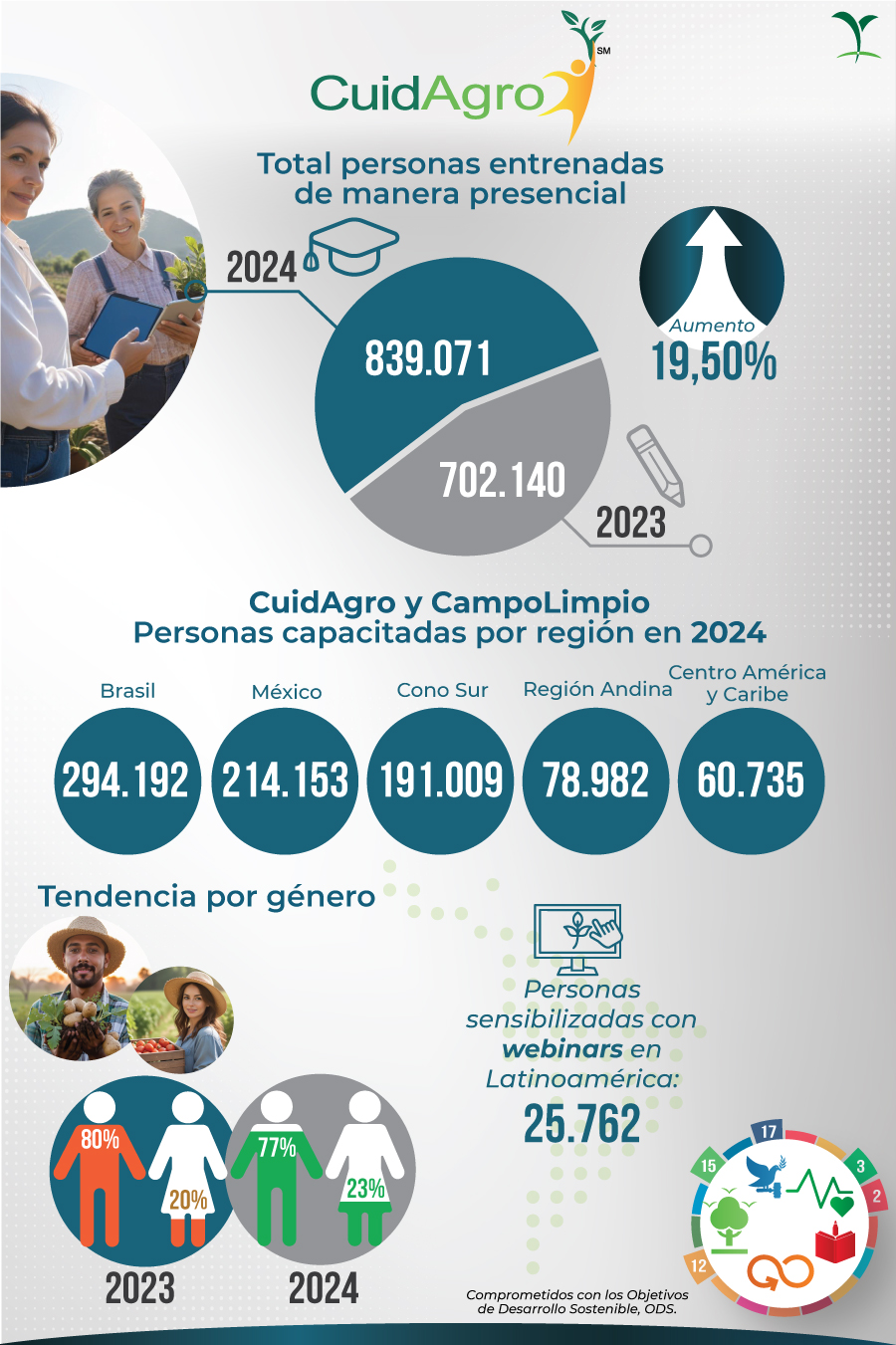Las Asociaciones Nacionales a través del programa CuidAgro capacitaron 317.049 personas. Logramos aumentar la cobertura de nuestras capacitaciones con el programa CampoLimpio, que desde hace varios años viene ofreciendo también jornadas educativas con los agricultores y otros públicos relevantes. En 2024 CampoLimpio capacitó y sensibilizó a 522.022 personas. Así llegamos a más de 800.000 personas beneficiadas, resalta Briceño.